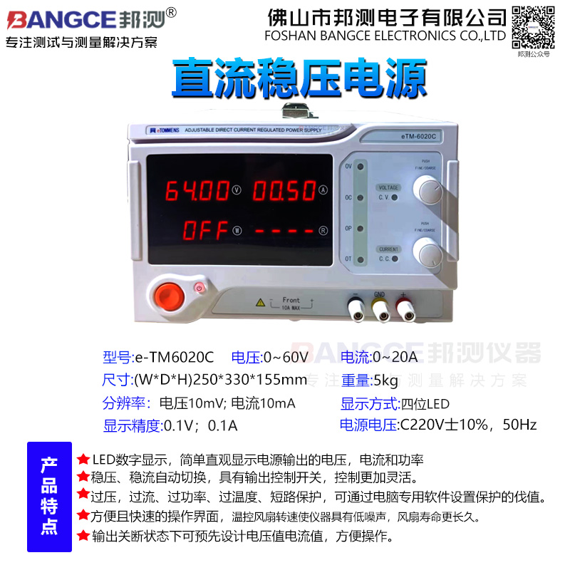 大功率四旋钮开关电源,四位LED直观显示电压、电流、输出功率和输出等效阻抗,具备10mV/10mA分辨率;具备短路、过压、过流、过功率、反极性保护功能。输出效率高,一键控制输出通断开关,方便安全。广泛应用于产品老化,电池充电、实验测试、生产测试、电解电镀等行业;广泛应用于产品老化维修,电池充电、实验测试、生产测试、电解电镀等行业。