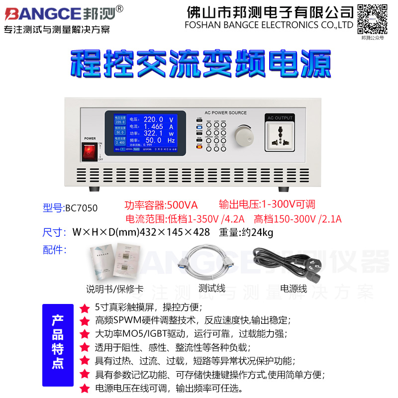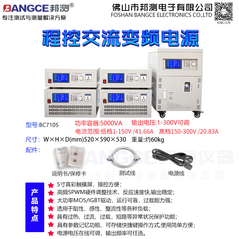 BC70系列变频电源是一款高性能的变频电源,可模拟世界各地电网的电压/频率,适用于家电、电动机、电动工具、军工、航天等行业的研发测试和生产测试。BC70系列变频电源具有超低的输出电压THD%、3倍过载能力、编程功能等特点。可选配RS232/RS485等通讯接口,实现对变频电源运行状态的实时监控。