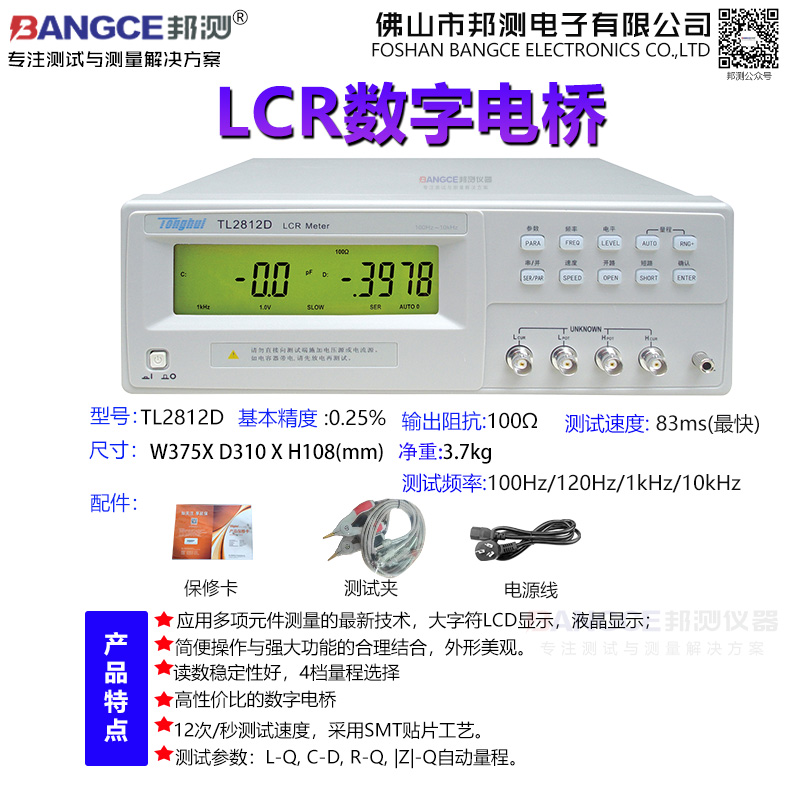 TL2812D型LCR数字电桥是本公司最新研制的低频元件测量的换代产品, 其中应用多项元件测量的最新技术,大字符LCD显示,采用SMT贴片工艺,操作方便,外形美观。可满足生产线质量保证、进货检验及自动化生产的需要。TL2812D为常州同惠最新推出的一款低价LCR数字电桥,可替代TH2811D,在夹具方面采用了TH26004s-1四端开尔文测试电缆,但精度由TH2811D的0.2%改为0.25%,内阻恒定100欧姆。
