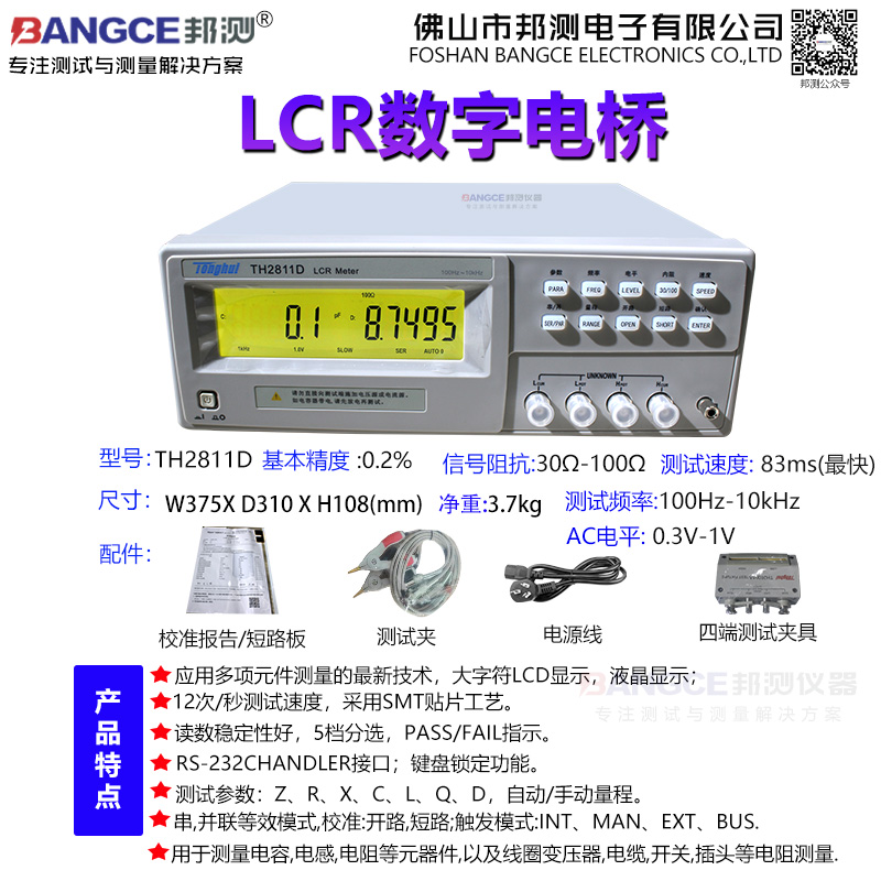 TH2811D型LCR数字电桥是本公司最新研制的低频元件测量的换代产品, 其中应用多项元件测量的最新技术,大字符LCD显示,采用SMT贴片工艺,操作方便,外形美观。可满足生产线质量保证、进货检验及自动化生产的需要。TH2811D为常州同惠最新推出的一款低价LCR数字电桥,在夹具方面采用了TH26004s-1四端开尔文测试电缆加TH26001A 四端测试夹具以及短路片,精度为0.2%,内阻30/100欧姆。