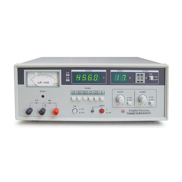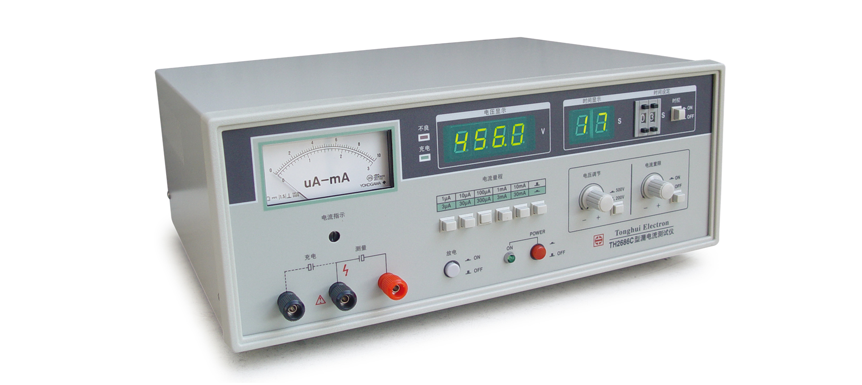 TH2686C型电解电容漏电流测试仪是一种能自动测量电解电容漏电流参数的测试仪器。测试电压连续可调。电压值、充电时间数字显示,电流值表针指示,充电—测试自动转换。具有电流超限指示,测试速度快,操作方便,安全可靠等特点。适用于生产线的质量保证及进货检验。