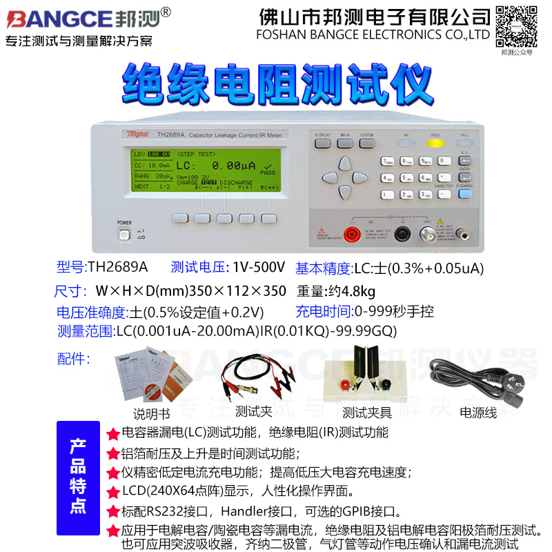 TH2689型电容器漏电流/绝缘电阻测试仪分别提供最大测试电压:800V,充电电流0.5mA~500mA(>100V时由最大输出功率50W限制)。主要应用于电解电容/陶瓷电容等漏电流,绝缘电阻及铝电解电容阳极箔耐压测试。也可应用突波吸收器,齐纳二极管,氖灯管等动作电压确认和漏电流测试。标配了RS232、Handler接口,可选购的GPIB接口,以及稳定快速的测量,使TH2689不仅可以应用于进货检验,更可应用于自动化生产测试等等。