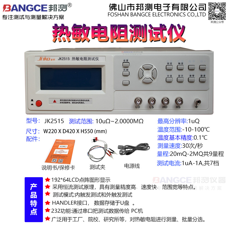 JK2515热敏电阻测试仪是一种高精度、宽测试范围的高速阻抗测量仪器,本仪器测量范围10uΩ~2.0000MΩ,采用恒流测试原理,具有测量精度高﹑速度快﹑范围宽等特点。在任一量程范围内,具有相同的测试速度;性能稳定,达到国内先进水平。仪器具有两种工作模式:常规模式、基准模式。常规模式用于PTC或普通电阻等不需要温度补偿的元件测试;基准模式用于NTC这类需要温度补偿的元件测试。本仪器可广泛用于工厂、院校、研究所等,对热敏电阻进行测量、批量分选。
