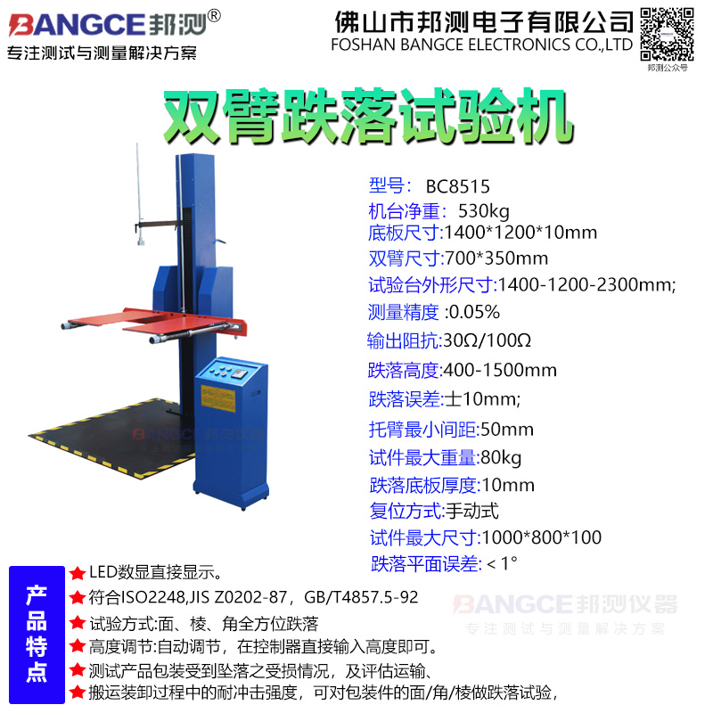 双臂跌落试验机主要用于考核包装件在实际运输、装卸过程中受到跌落冲击的影响程度,评定包装件在搬运过程中耐冲击强度和包装设计的合理性。满足标准:双臂跌落验机符合GB4757.5-84 JISZ0202-87 ISO2248-1972(E)等国家标