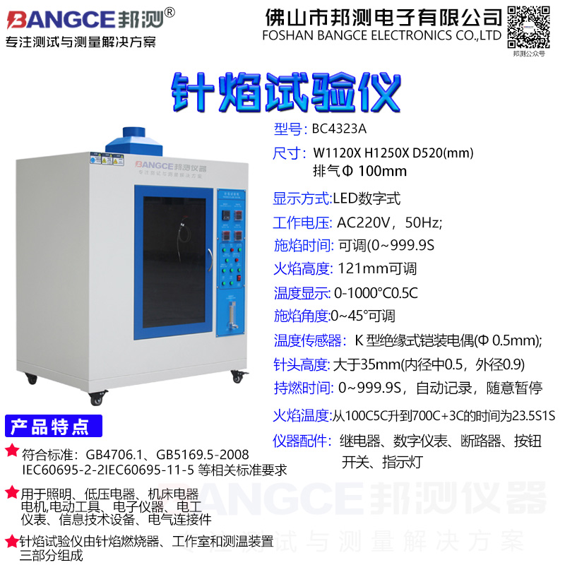 针焰试验仪是用规定尺寸(Φ 0.9mm )的针状燃烧器,通以特定燃气(丁烷),以 45° 角定时定向施燃试品,视试品是否引燃及持燃时间和燃烧长度来评定设备内部因故障条件造 成的小火焰的着火危险性。