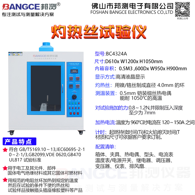 用规范的电阻丝环加热到规定的温度,然后在试验的条件下使灼热丝和试验样品接触插头插座橡胶塑料等产品。