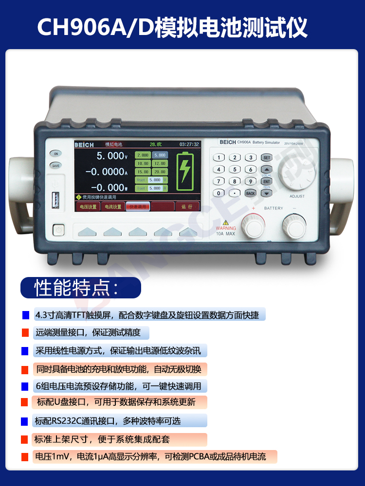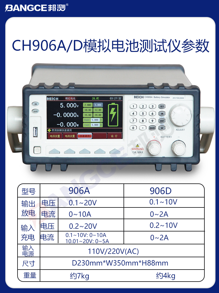 CH906系列模拟电池测试仪是我公司新推出的一款集充放电一体,可完全模拟电池的充放电过程的仪器,电源部分采用线性电源方式,保证输出电源低纹波杂讯,可代替电池对普通适配器或移动电源的PCBA板进行功能或性能测试。主要应用于移动电源、适配器、蓝牙耳机、蓝牙音箱等电池充放电产品的开发和实验,也可当作普通可调电源使用。其输入输出电压,和输入输出电流保护值均可多组设定。