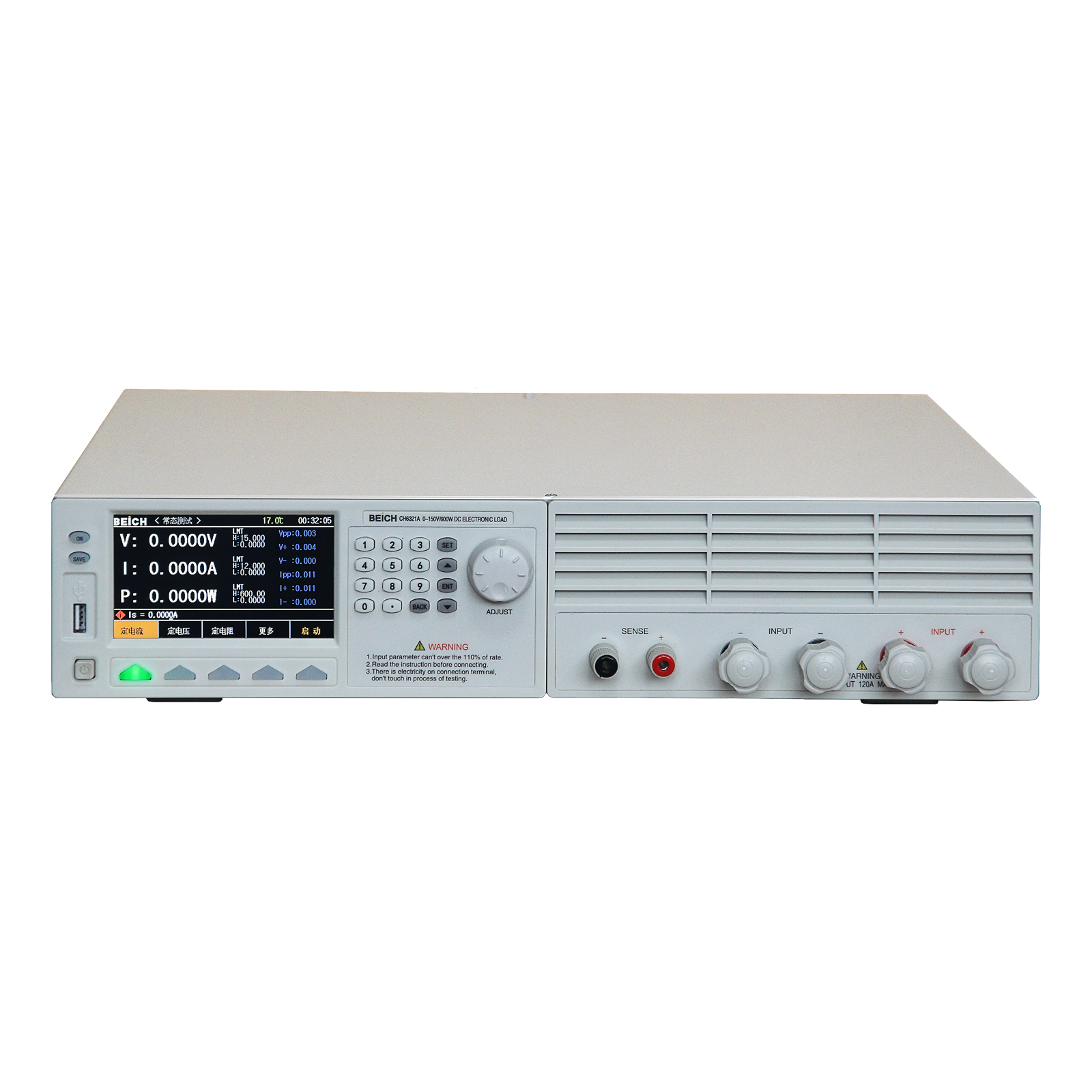 CH6321X 系列程控直流电子负载主机采用高性能 ARM 处理器配合高性能高速采样 AD;4.3 寸 TFT 彩屏支持中英文界面,配合精心设计的引导式菜单,操作得心应手;显示信息丰富全面,负载操作与快充电压选择同时显示;拥有 0.0001的更高显示分辨率,更能精确监控被测产品的电压电流细节;USB HOST 可以方便的使用 U 盘进行数据保存及固件升级;全面的比较器功能配合 HANDLER 接口,使得生产线批量测试和系统化测试更加有保障;拥有丰富全面的负载功能:定电流 CC,定电压 CV,定功率 CP,定电阻 CR,电池放电测试(屏幕可以显示实时放电曲线),动态测试(测试电源动态输出性能),列表测试(测试电源在多种负载条件下的表现);柔性的软硬件构架可满足用户订制组合测试功能的要求,从而提高生产线测试效率;智能化的风扇控制和优良的散热性能,配合过电压、过电流、过功率、过热和电压极性反接等多种完善的保护报警措施,使得仪器更具可靠性和安全性;仪器全系标配有 RS232 接口,配合丰富的 SCPI 指令集,可方便连接到电脑,进行实时数据采集和仪器控制。性能优越的电子负载可广泛运用于电源变压器,充电器,开关电源,各类电池等行业的生产线测试、产品老练与实验室等试验研发领域。