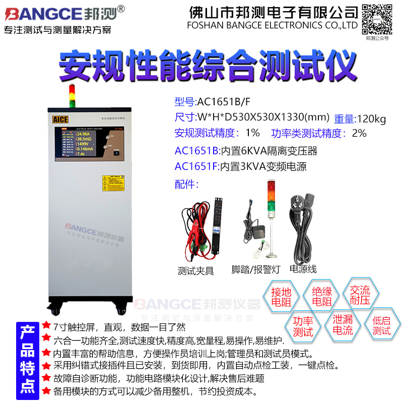 所有用电器都有漏电的可能,造成人身安全或火灾隐患。为有效预防,各标准法规详细 规定了用电器出厂前进行安规测试的要求。安规测试通常分为电气强度(耐压)、绝缘电阻、 接地电阻和泄漏电流四种方式。安规分析仪可以按照标准规定的方法测出数据,对照标准规 定的限值,判断被测物是否满足出厂条件,保证产品质量以减少安全隐患。艾测公司研制的 安全性能综合分析仪可以通过一次接线,快速、准确、合规得进行所有安规项目测试,还具 备功率和低压启动等其他项目,大幅提升工厂的生产效率。