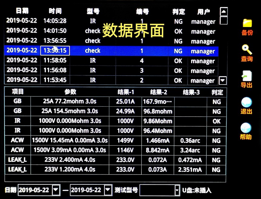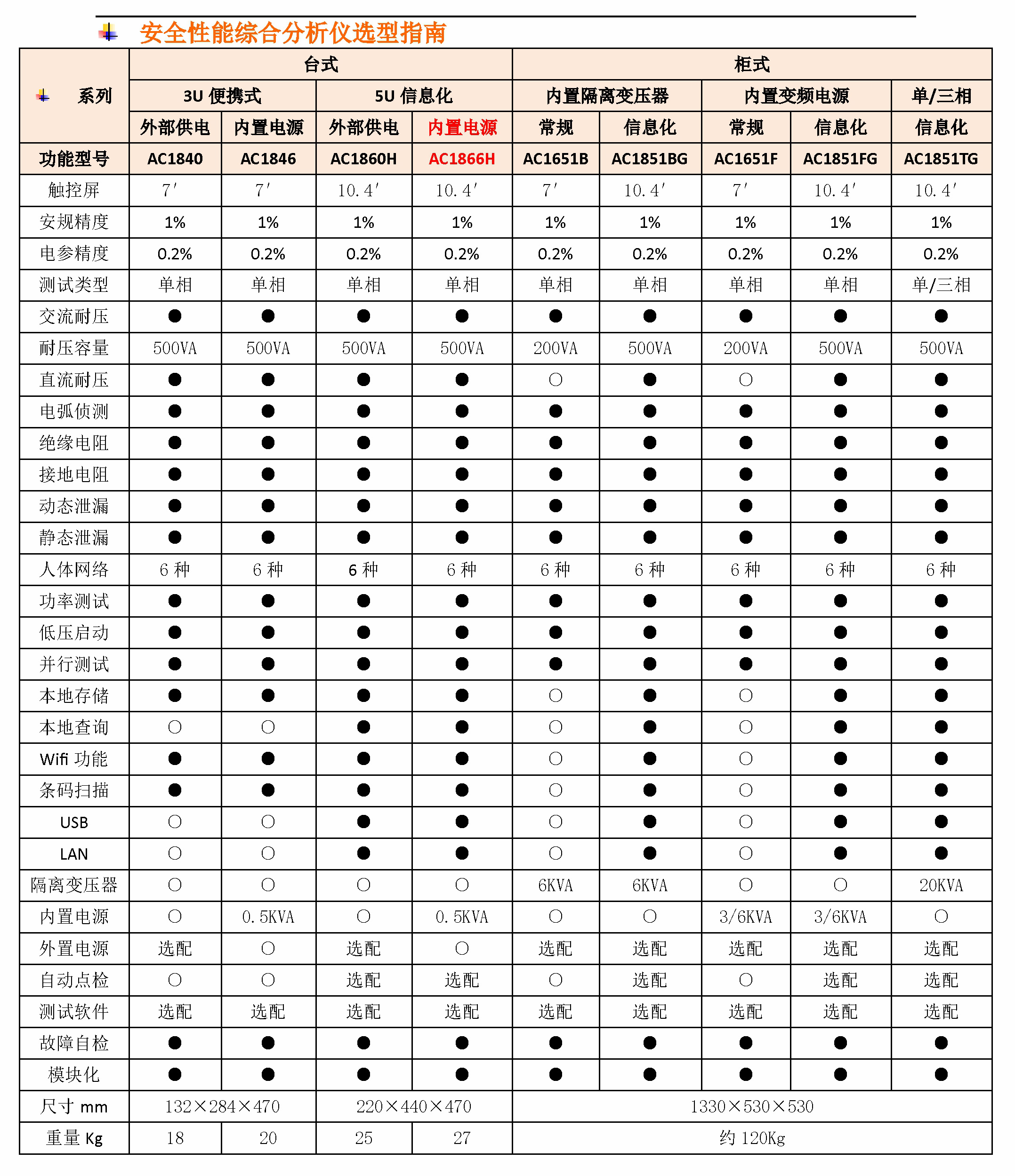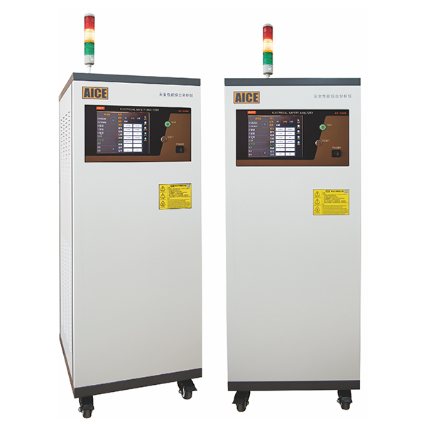 所有用电器都有漏电的可能,造成人身安全或火灾隐患。为有效预防,各标准法规详细规定了用电器出厂前进行安规测试的要求。安规测试通常分为电气强度(耐压)、绝缘电阻、接地电阻和泄漏电流四种方式。安规分析仪可以按照标准规定的方法测出数据,对照标准规定的限值,判断被测物是否满足出厂条件,保证产品质量以减少安全隐患。单相和三相的用电器,其安规测试也不尽相同。本产品AC1851TG型单/三相安规综合分析仪可以兼容多种供电类型,测试单相和三相用电类型的被测物。通过一次接线,快速、准确、合规得完成所有安规项目测试,还可测试功率和低压启动等其他项目,大幅提升工厂的生产效率。该产品还具备强大的信息化功能:本机具备测试数据(16G)存储功能,屏幕上就可以查询和分析,支持USB导出;还具备LAN/RS232/WiFi等丰富接口,本机可直接对接MES系统,节省工控机。可选配内置自动点检工装,实现一键点检。
