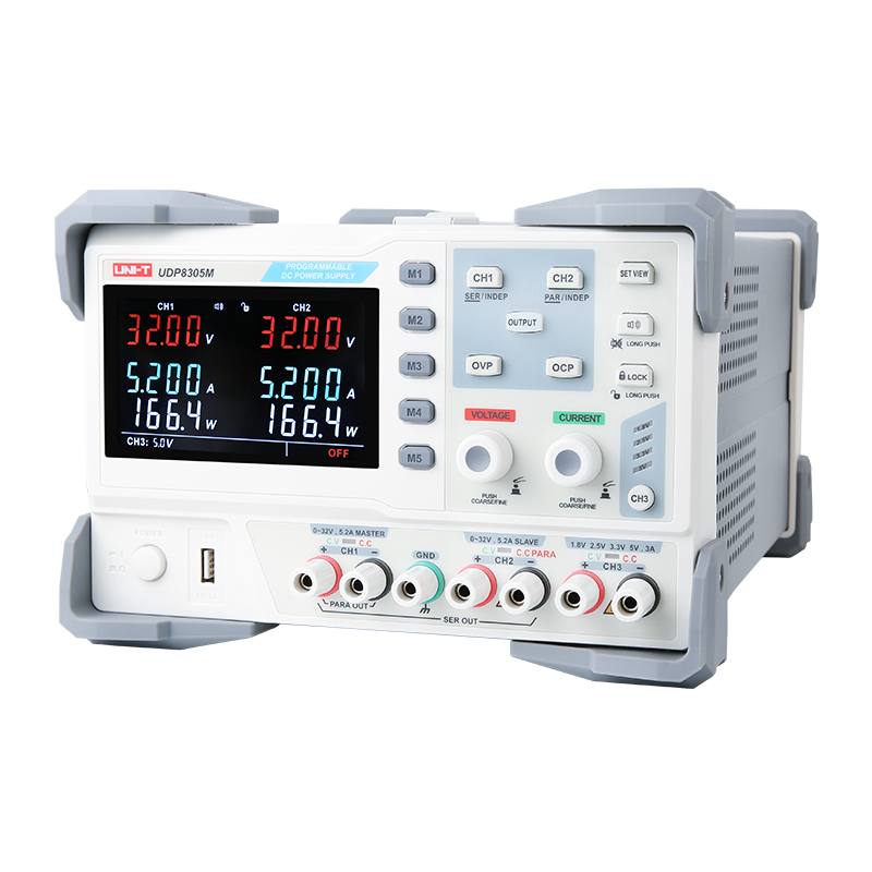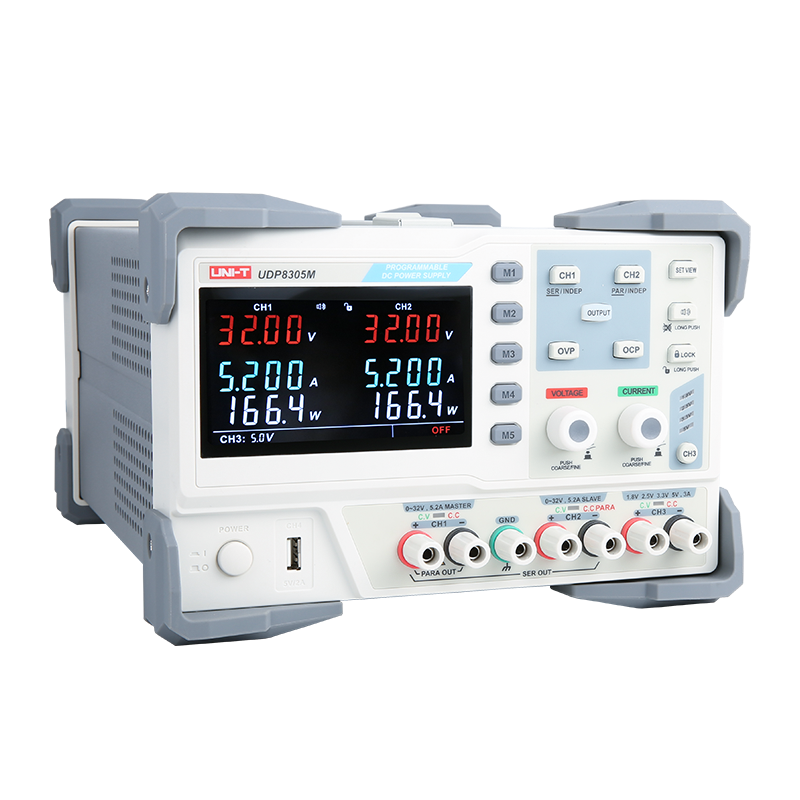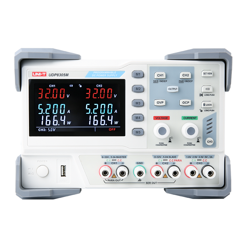 UDP8000M系列可编程直流电源,四路独立输出,两组32V/3.2A/5.2A可调输出,一路固定可选输出:电压1.8V/2.5V/3.3V/5V(可微调),电流3.2A,一组USB(5V/2A)输出,具有CV与CC模式,短路与过压保护功能,满足多样化的测试需求。