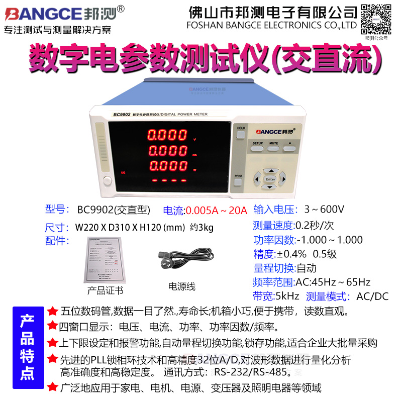 BC9902交直流数字电参数测量仪(又名数字功率计)内部采用高性能取样部件,并应用了先进的PLL锁相环技术和高精度32位A/D,对波形数据进行量化分析,保证了仪器的高准确度和高稳定度。现已广泛地应用于家电、电机、电源、变压器及照明电器等领域,是传统式指针表和数字式电工仪表的理想换代产品,它功能强大,机箱小巧的经济型智能电量测量仪,能测试交流、直流电参数如:电压、电流、功率、功率因数/频率都能通过仪器窗口直接读取,方便直观。仪器具有自动量程切换功能,还具备电压、电流、功率/功率因数上下限设定和报警功能,并具备锁存功能,特别适合生产线大批量测试。