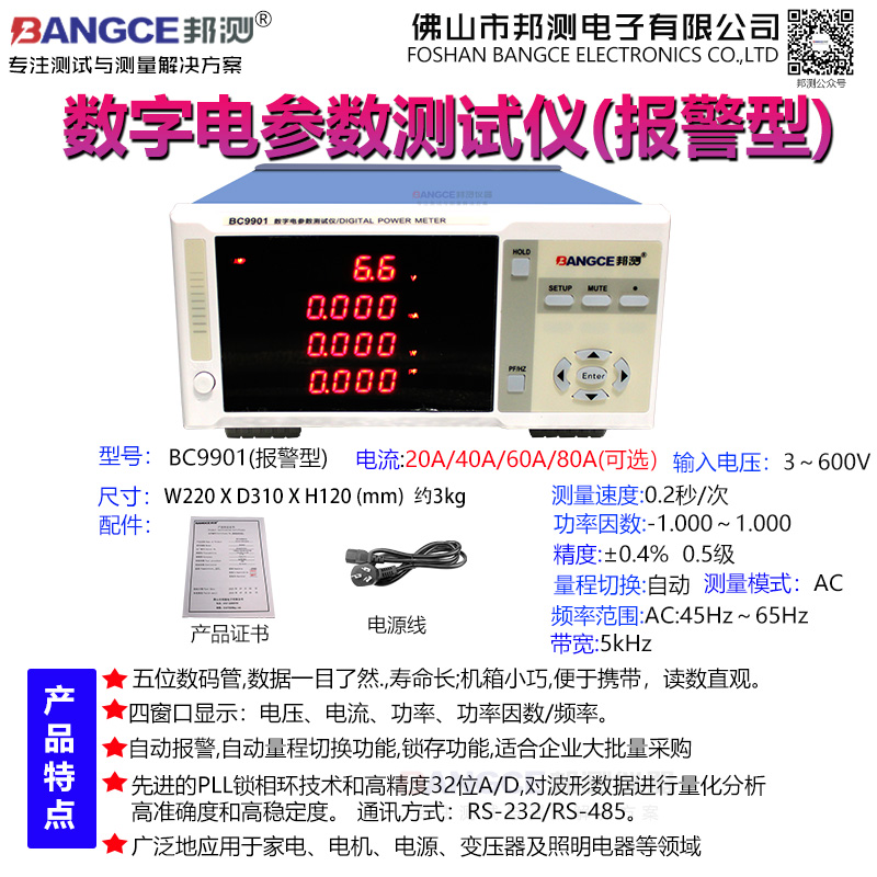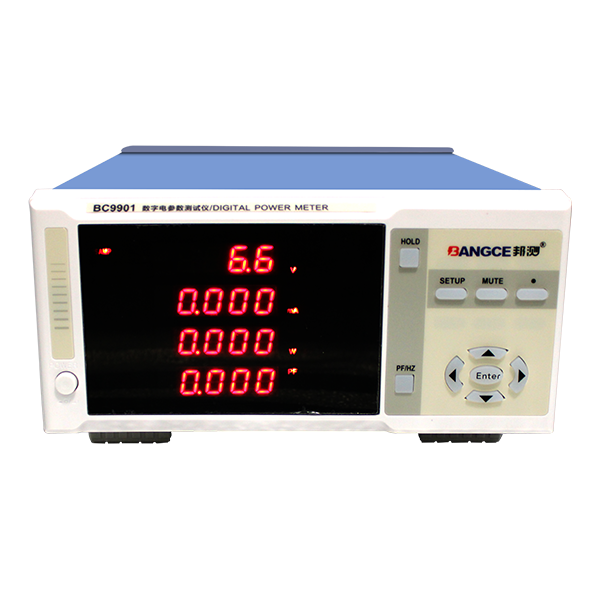 BC9901系列数字电参数测量仪(又名数字功率计)内部采用高性能取样部件,并应用了先进的PLL锁相环技术和高精度32位A/D,对波形数据进行量化分析,保证了仪器的高准确度和高稳定度。现已广泛地应用于家电、电机、电源、变压器及照明电器等领域,是传统式指针表和数字式电工仪表的理想换代产品,它功能强大,机箱小巧的经济型智能电量测量仪,电参数测量如:电压、电流、功率、功率因数/频率都能通过仪器窗口直接读取,方便直观。仪器具有自动量程切换功能,还具备锁存功能,适合企业大批量采购。