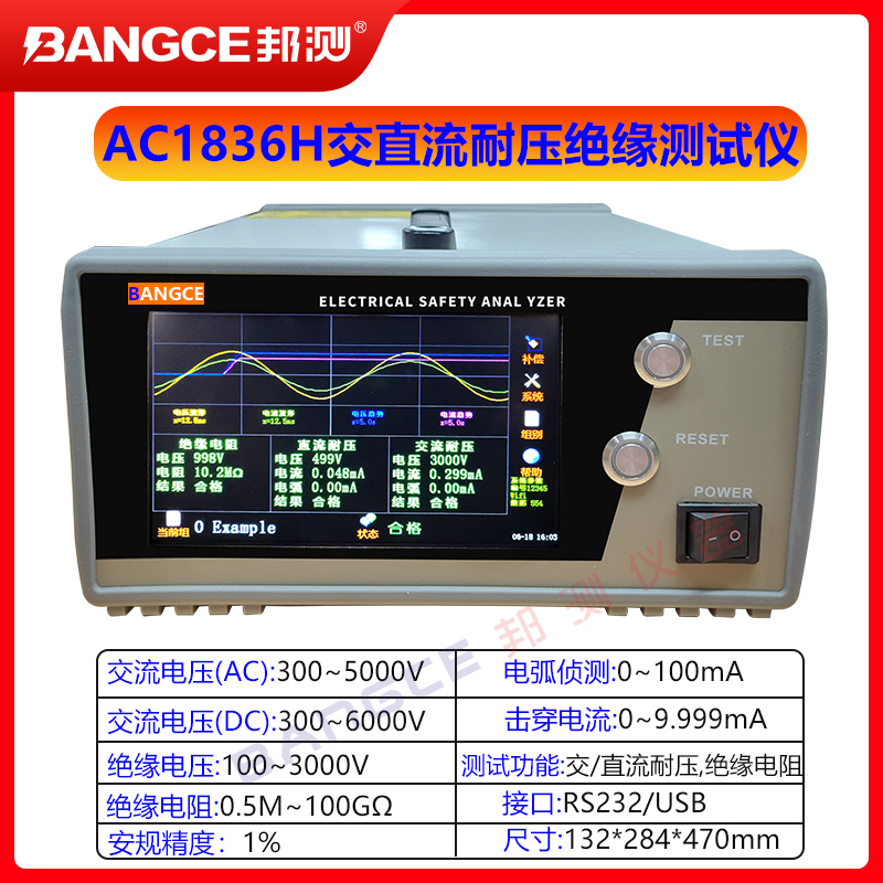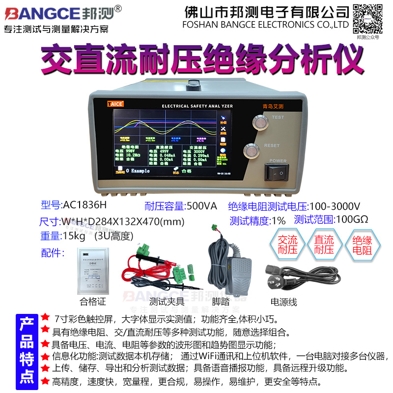 AC1836H型台式安规分析仪具有交/直流耐压、绝缘电阻等项目的测试分析功能,能显示电压、电流和电阻的波形图以及趋势图,以便更直观的监测分析绝缘性能和绝缘崩溃时的各项指标,适用于高要求的测试分析场合。产品具有测试参数范围宽(3000V/100GΩ)、容量大(5KV/100mA)、精度高(1%)和显示波形等优势。采用触控屏设计,操作简便,显示直观,有语音播报功能;功能电路高度集成,体积小重量轻;测试数据本机缓存,通过WiFi通讯和上位机软件,支持多台仪器对接一台电脑,实现测试数据的上传、储存和分析,软件还具备界面监测、断网续传等实用功能