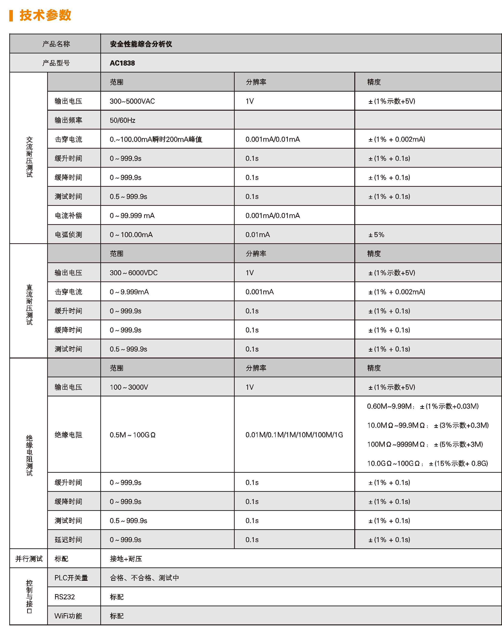 a) 绝缘电阻测试电压100-3000V(可选6000V),测试范围达100GΩ;