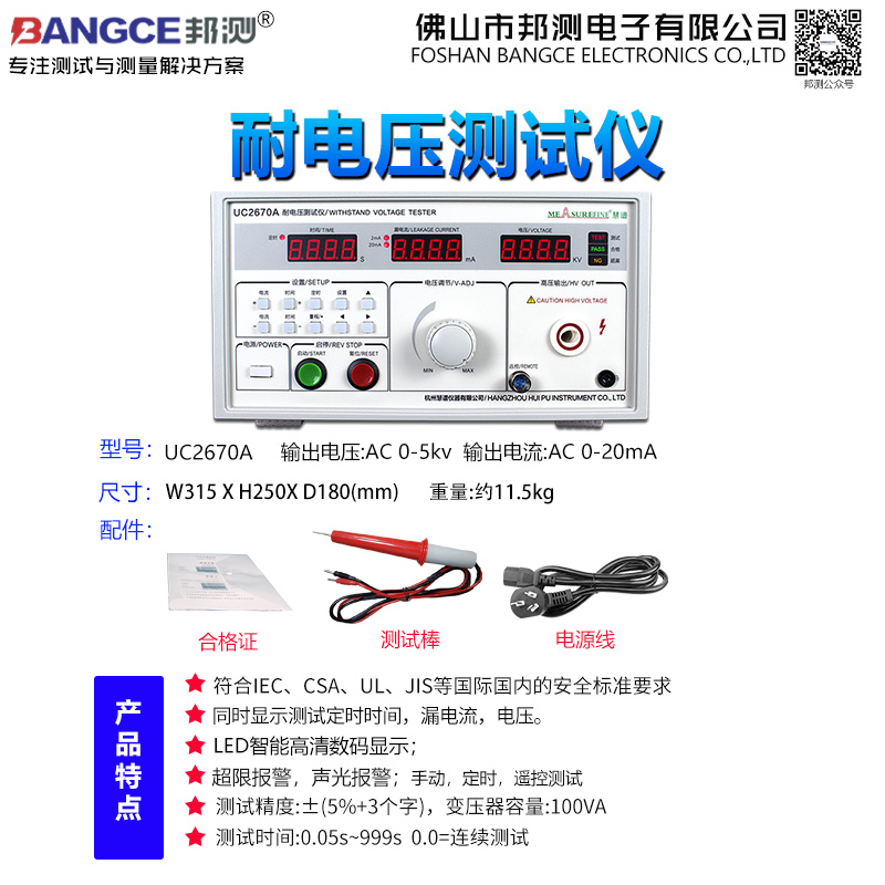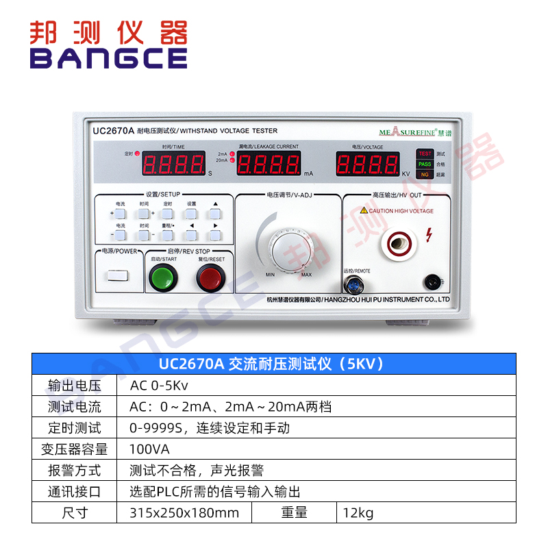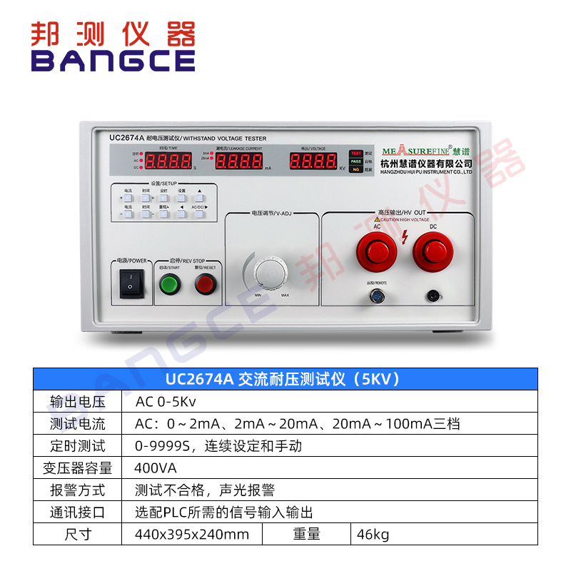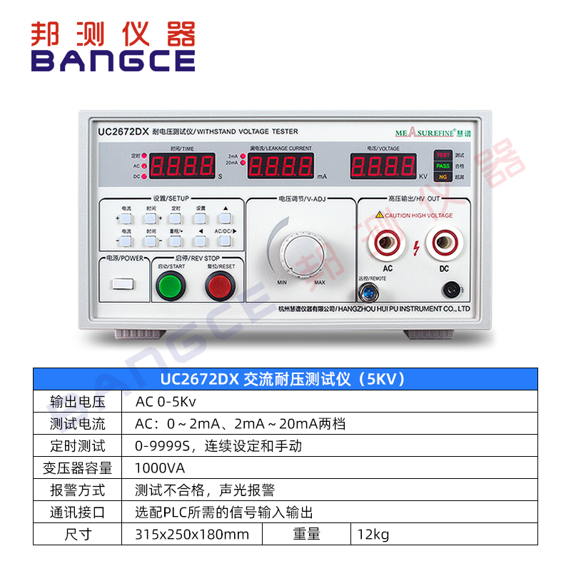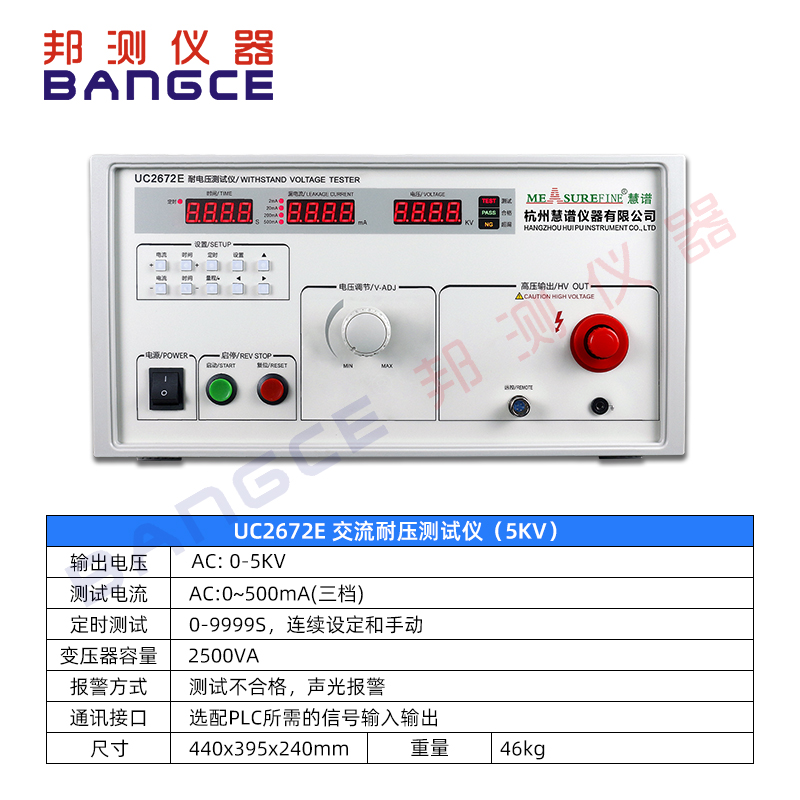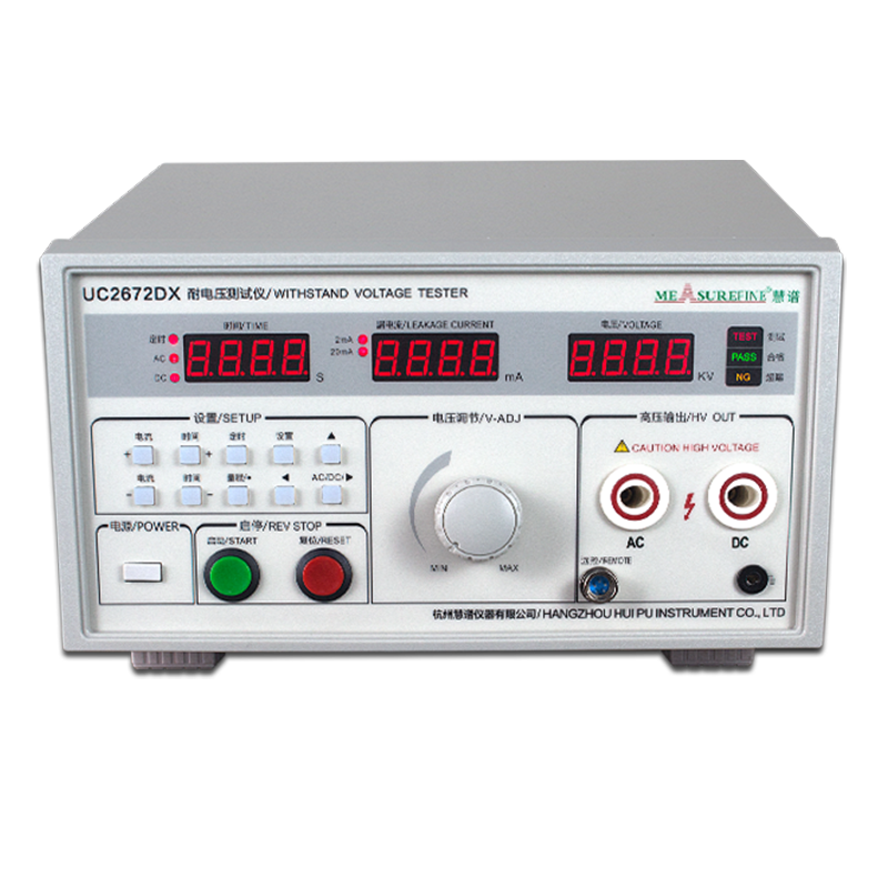 耐电压测试仪是测量耐压强度的仪器,它可以直观、准确、快速、可靠地测试各 种被测对象的击穿电压、漏电流等电气安全性能指标,并可以作为高压源用来测试元 器件和整机性能。慧谱耐电压测试仪产品系列是按照 IEC、CSA、UL、JIS 等国际国 内的安全标准要求设计的,适合各种家用电器、电源开关、电线电缆、变压器、接线 端子、高压胶木电器、电机、医疗、化工、仪器仪表等,以及强电系统的安全耐压和 漏电流的测试、同时也是科研实验室、技术监督部门不可缺少的耐压试验设备。耐压仪电流、时间等均采用程控一键调节,具有调节精度高、速度快、操作便捷等优点